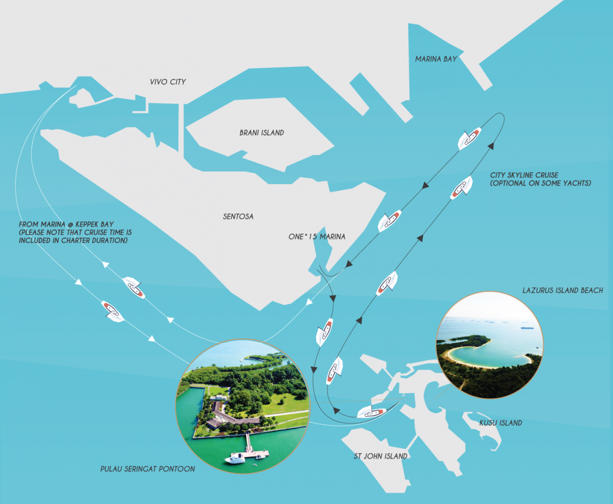 The yacht will commence its cruise from either marina (depending on where the yacht is berthed) and will sail out for the southern islands. The yacht will then anchor around the Pulau Seringat pontoon or in front of Lazarus beach, for guests to commence on various activities such as exploring the island, swimming, kayaking or walking along the sandy beach. Please note that the yacht will anchor at one location as per the Captain’s discretion, depending on the sea current on that day. The yacht will not change location after anchoring. For safety reasons due to visibility, all water activities will also have to stop by 7pm.