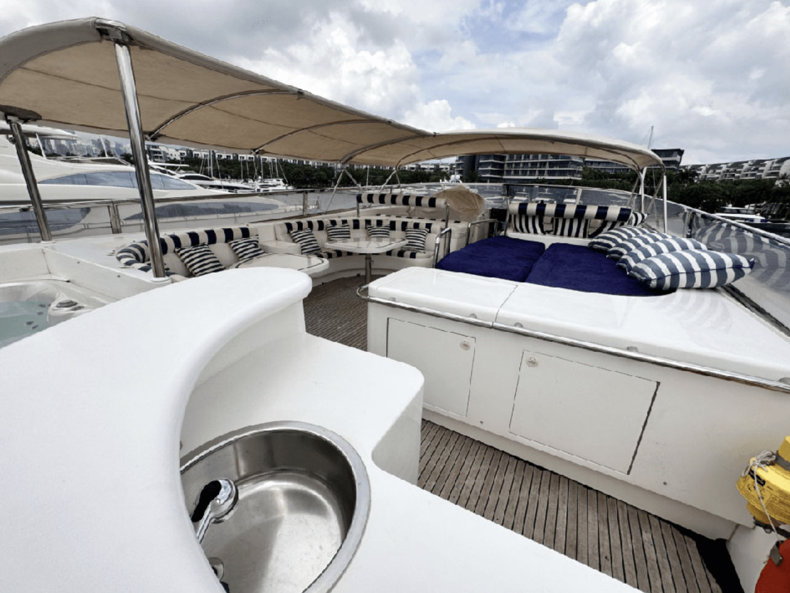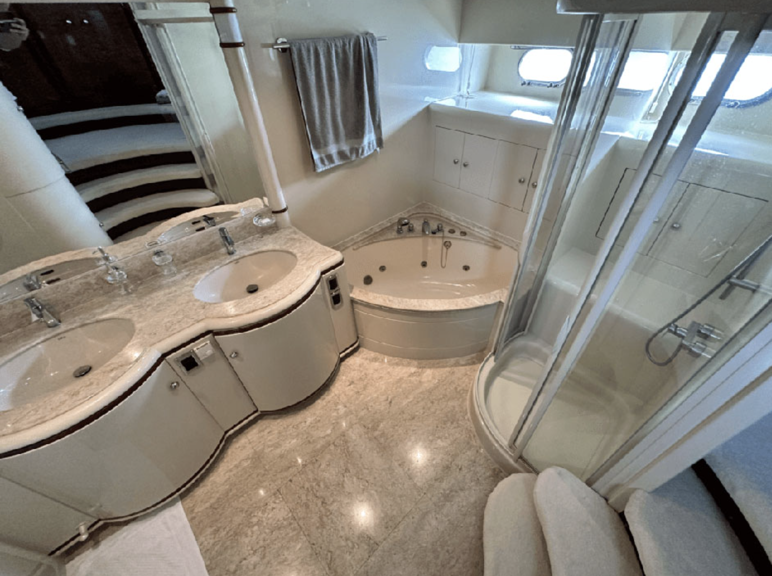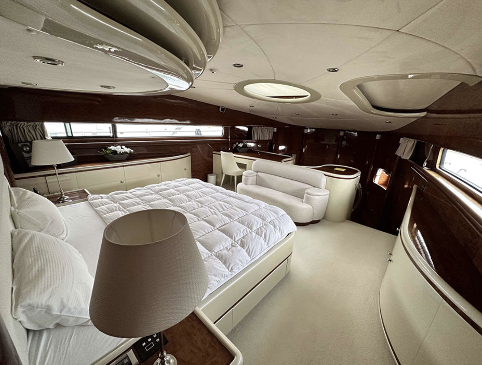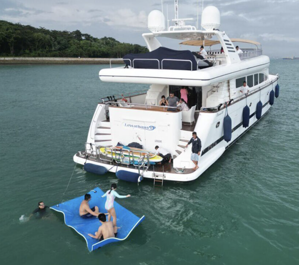 Leviathan 8 yacht, is a 105ft yacht boasting a very spacious flybridge to soak up the sun, dip in the Jacuzzi, or sit and enjoy the views under the shade. Filled with toys, Top quality service provided by her highly-praised and professional crew. Leviathan 8 offers accommodation for up to nine guests in five staterooms. The master stateroom is located forward on the main deck and a curved staircase takes you down to the vanity and large en suite bathroom featuring a Jacuzzi tub and shower